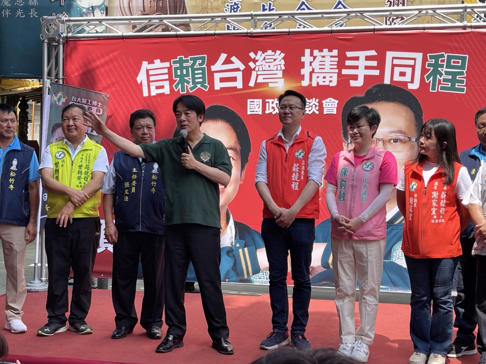 選戰週日,賴清德陸戰行程滿檔。他1日上午前來台中北屯區,分別到東山路一段軍福宮與松竹路二段松竹寺參香祈福,並參加「信賴台灣、攜手同程」國政座談會,為莊競程助選,受到軍福宮主委古明源、松竹寺主委張文進等共逾千人熱烈歡迎,莊競程、3Q陳柏惟、市議員曾朝榮、謝家宜、陳俞融,民進黨台中市黨部主委李天生等人都到場陪同,並在廟埕合影,賴清德分別各停留約40分鐘。