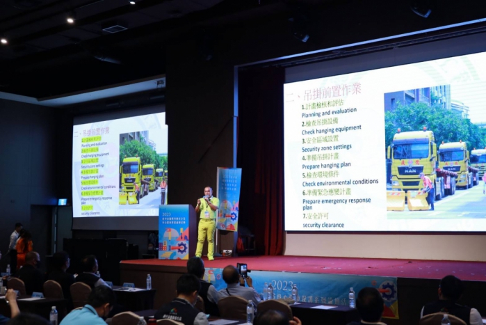 張大春提到,會中也邀請國內起重機產業龍頭「啟德機械起重工程股份有限公司」,由董事長胡漢龑親自分享吊掛作業危害預防議題,胡董事長不但吊掛工程經驗豐富,更積極響應政府離岸風電政策,投入義務救災與熱心公益,希望藉由此公司「施工安全第一、人員機器安全第一」等精神,提醒事業單位重視安全衛生及勞工身心健康保護措施,防止職業災害發生。