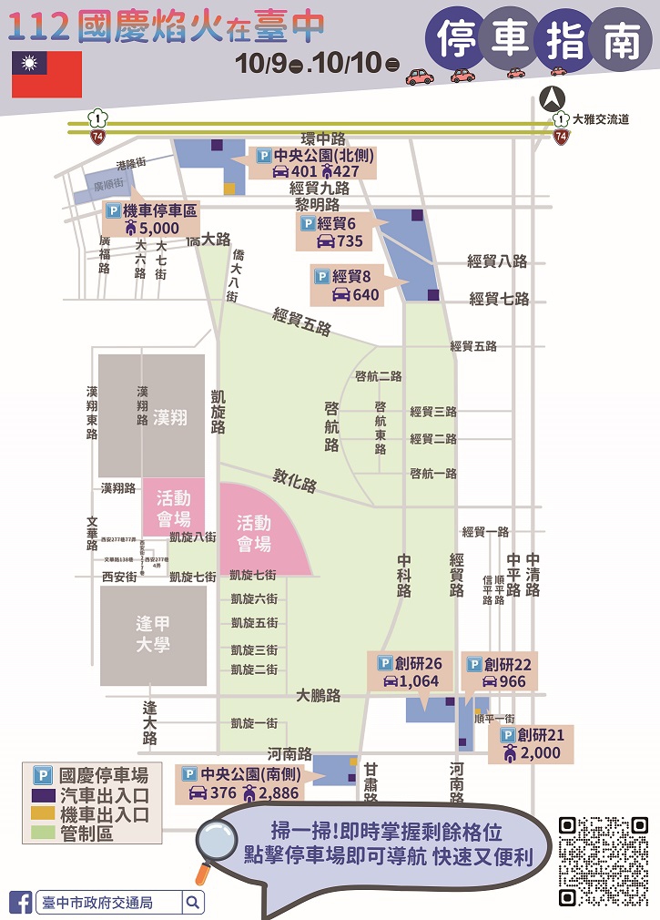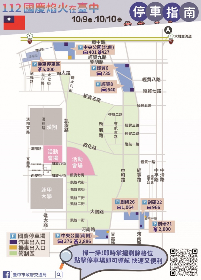 交通局指出,市府特別規劃16處推薦觀賞點,民眾不必擠進會場即可欣賞焰火美景,其中10月10日自下午5時30分到晚上9時30分也安排精彩的表演活動、國慶焰火及演唱會。相關交通資訊請至官方網站查詢( https://1010.taichung.gov.tw ),停車資訊也可透過國慶焰火周邊停車場網頁網址查詢( https://e-traffic.taichung.gov.tw/Parking/ParkingTable/index ),點擊即可導航,並提供最即時的剩餘車格資訊,歡迎大家一同欣賞璀璨焰火!