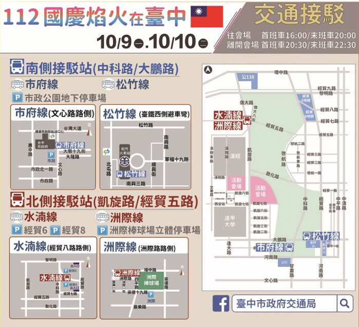 「還有免費接駁2+2」葉昭甫進一步表示,活動兩天市府在會場南北側兩端提供「2+2」的免費接駁路線,南側會場接駁站規劃有市府線、松竹線;北側會場接駁點規劃有水湳線及洲際線,往會場首班車自下午4時至晚間8時、離開會場時間自晚間8時30分至10時30分,坐滿即開車。