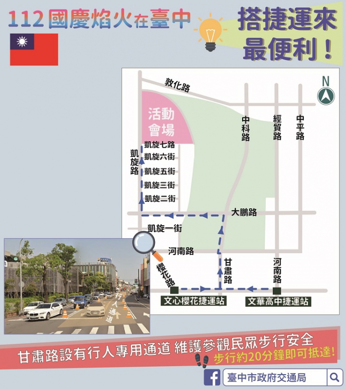 「搭捷運!快速又便利!」交通局長葉昭甫表示,活動場地鄰近捷運綠線,民眾可選擇搭乘捷運至文心櫻花站或文華高中站下車後,步行前往會場,約20分鐘即可抵達!中捷公司也會加密捷運班次,活動期間約6分鐘一班車,交通局也在甘肅路上特別規劃人行專用通廊,以交管器材圍設空間並搭配導引牌面,維護民眾步行安全。
