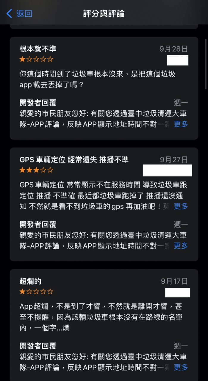 但周永鴻接到民眾陳情App時常無法顯示垃圾車即時動態,讓民眾感到困擾。例如表定早上9點13分的垃圾車提早至9點以前或是延至9點半後到,App仍然顯示在原本表定時間抵達,就算App有更新預計抵達時間,還是會出現時間回溯的情況。周永鴻檢視「臺中垃圾清運大車隊」App評論區,發現多個評論指出類似問題。
