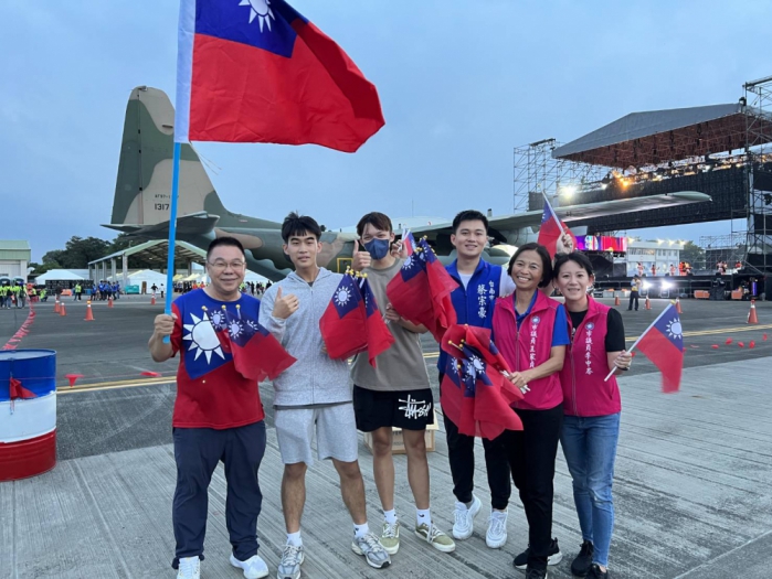【記者鄭永徳台南報導】國民黨台南市議會書記長蔡育輝議員,9日帶著黨團王家貞、李中岑、蔡宗豪、林燕祝幾位議員前去國慶晚會舉辦地點台南市空軍基地,分送國旗給鄉親,祝賀中華民國生日快樂!