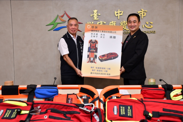 【記者林獻元台中報導】善心企業家林天星先生及王幸子女士賢伉儷熱心公益,愛心捐贈不落人後,為體恤消防人員工作辛勞,並提升其緊急快速救援能力,捐贈RIT快速救援板及RIT救援包各12組,增進台中市政府消防局各大隊RIT專責分隊快速救災裝備能量,讓消防人員救災更有保障。