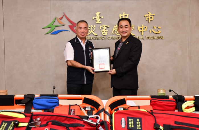 捐贈儀式於11日早上於消防局5樓災害應變中心舉行,由消防局長孫福佑代表受贈,並回贈感謝狀給受贈代表蔡榮晉先生。