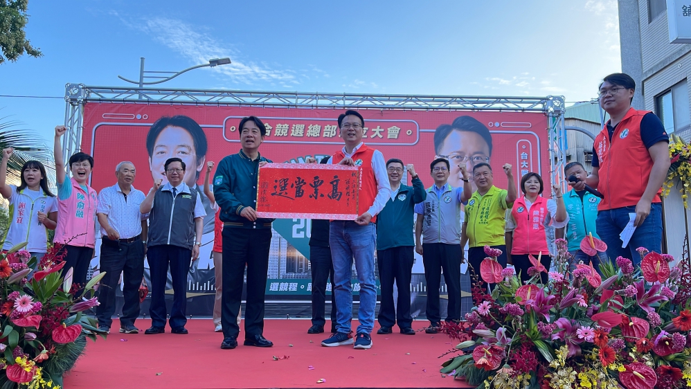 【記者林獻元台中報導】民進黨總統參選人賴清德合體台中市第五選區立委參選人莊競程,14日成立聯合競選總部,這也是賴清德全台第一場聯合競總成立大會,賴清德親自到場,為莊競程授戰旗、披戰袍,並送上「高票當選」卷軸,推薦莊競程是第一名立委,值得鄉親們支持連任。
