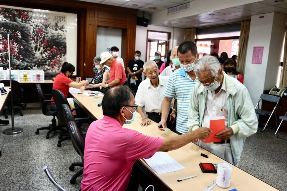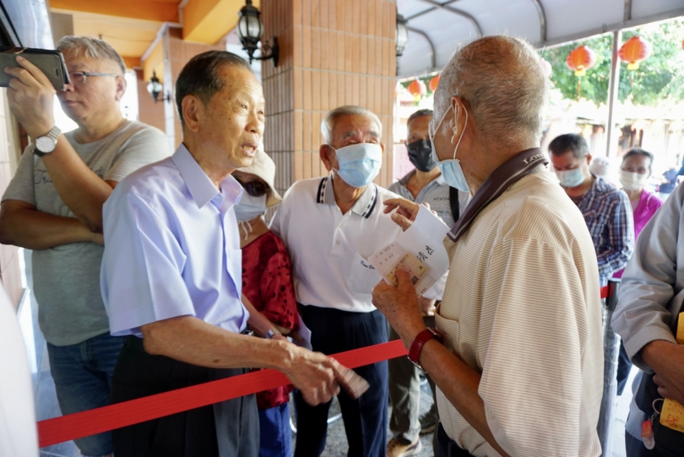 至於90至99歲耆老敬老禮金,15、16日兩天發放。15日上午九點,萬和宮在一樓會議室開始發放敬老禮金,幾位行動自如的長者,八點多到場等候。「恭喜哦!」「恭喜哦!」董事長蕭清杰看到耆老們親切問候。
