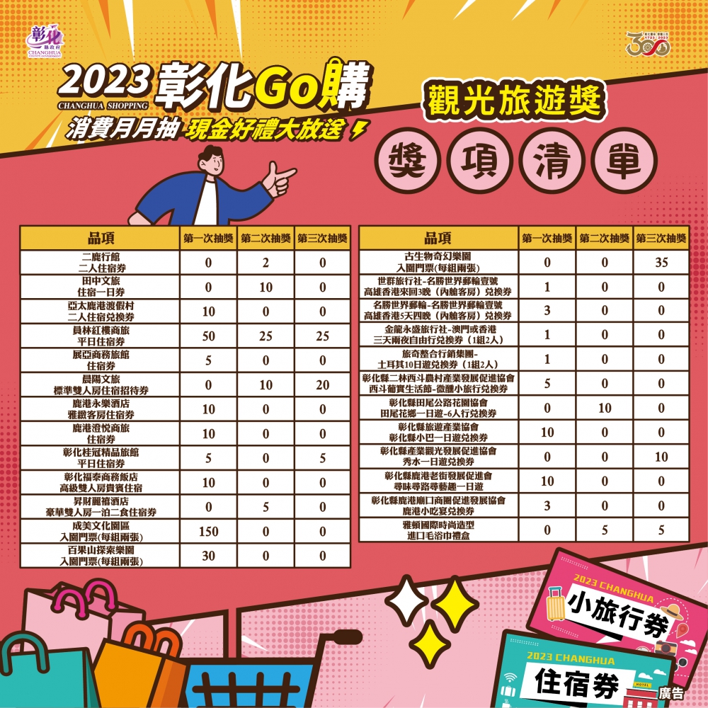 王縣長表示,三次抽獎提供1萬多個獎項,幸運得主縣府將於1天內發出中獎簡訊和領獎通知電子郵件,請得獎者依指示在網站-最新消息公告日後14天內將領獎文件「登錄會員身分證」、「發票或收據」和「存摺」拍照上傳電子檔給兌獎小組,核對無誤後盡快核發獎項,兌獎小組不會主動要求中獎者操作ATM轉帳匯款,請大家留心勿受騙。
