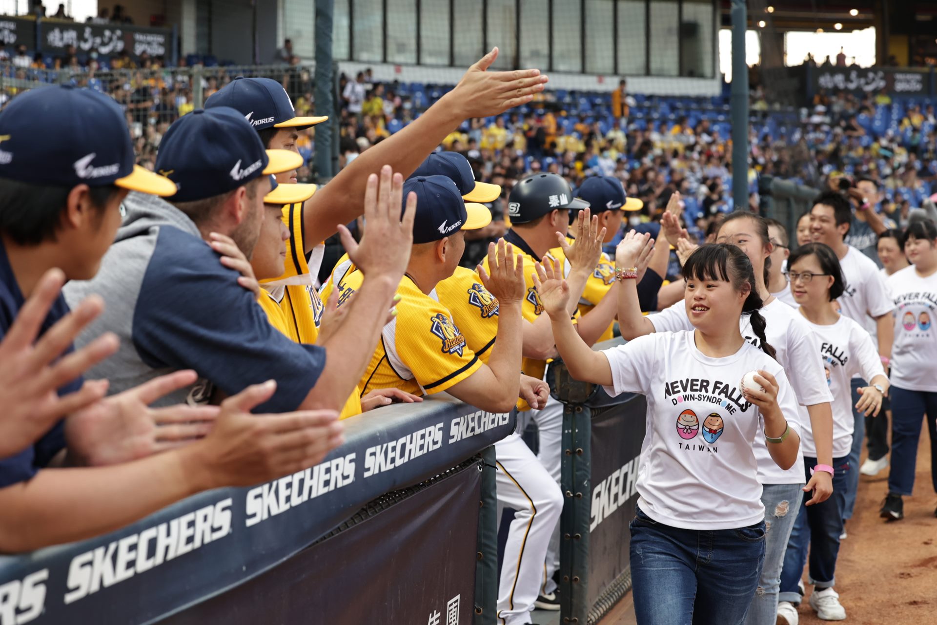 ▲唐寶寶與中信球員擊掌。(唐氏症基金會提供)