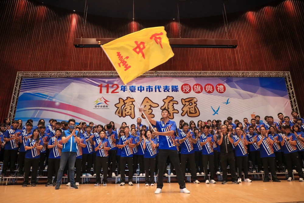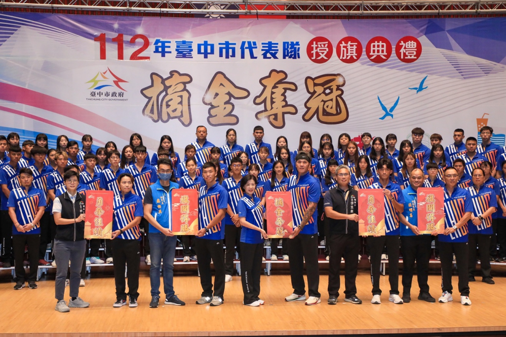112全運會台中市代表隊授旗,包括副市長王育敏、運動局長李昱叡、台中市體育總會秘書長暨市議員蘇柏興、副秘書長張明昌、划船委員會主委許世彬、游泳委員會主委李振昌以及台中市代表隊等均踴躍參加。