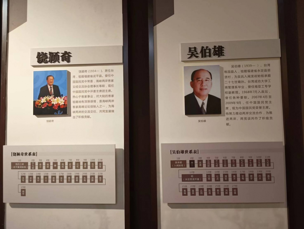 第三展廳有客家各宗枝向台灣及海內外播遷及族譜傳世問題,客家人開發建設台灣的歷程,客家族譜文化傳承弘揚。在所列「軍政人物˙彪炳千秋」所列從明末到至今,傑出的客家名單中,台灣的前立法院副院長饒穎奇與前總統府祕書長吳伯雄※又榜上有名。