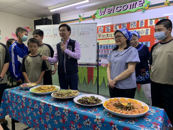 市府客委會表示,此次客家美食創意料理,主要結合台中客家庄產業如東勢咖啡、新社香菇、東勢橘子、酸菜、福菜等食材,由青年學子引導長者發想「許願料理」,由青銀組創作濃郁回香的「咖啡排骨」、老老組烹調高纖高蛋白富含營養價值的「福菜麥片蝦」、老少組融合客家酸菜與新鮮鯖魚共創新風味的「鹹菜魚」、少老組引用剛上市的東勢柑橘烹調出獨一無二「宮保橘丁」及採用女媧補天概念製作的「五色水餃」,各項創意料理皆兼顧美食美味健康,現場香氣四溢,令人食指大動,老老少少都很興奮,對成果更是滿意!