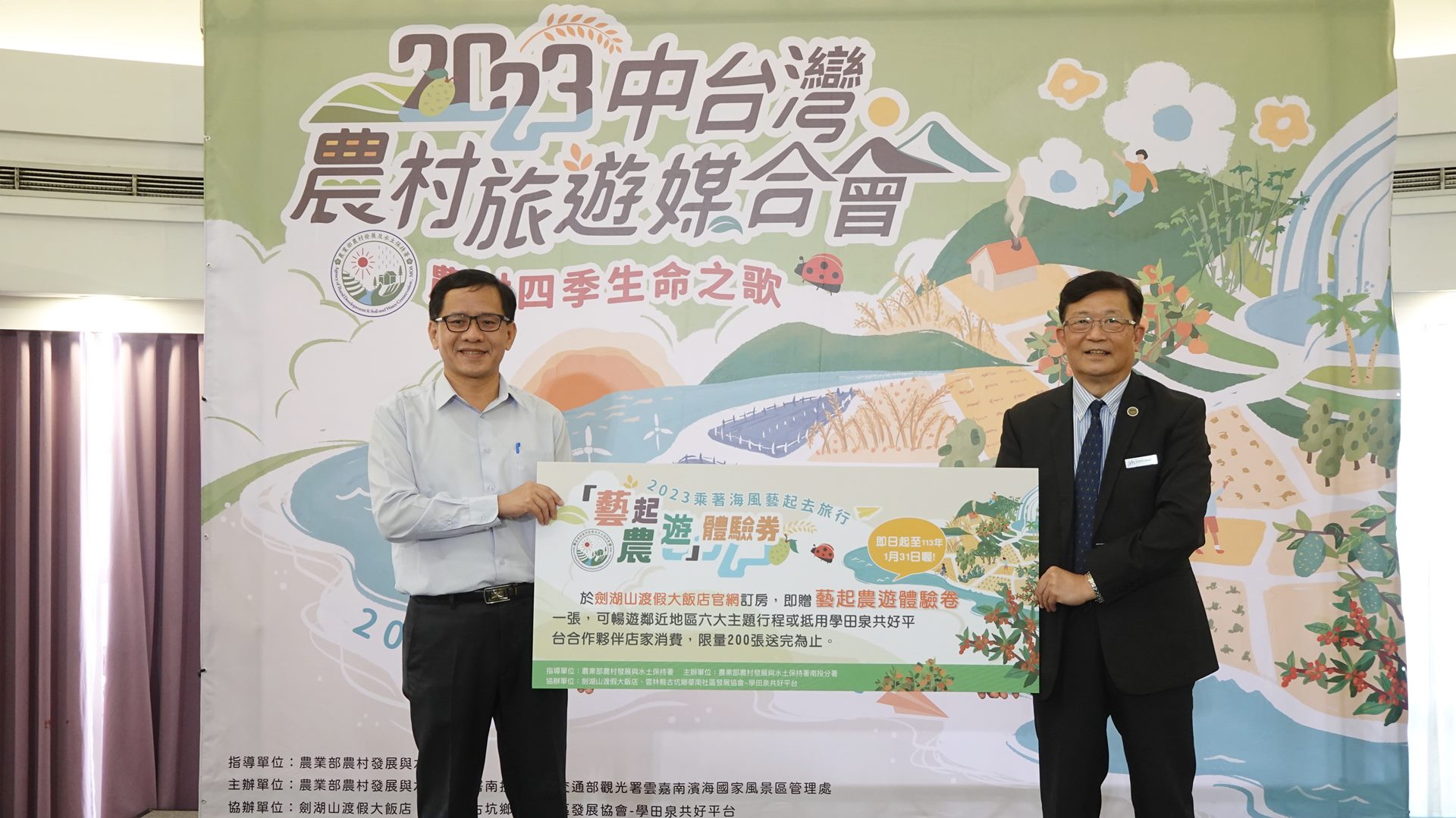 ▲農村水保署南投分署分署長傅桂霖與劍湖山渡假大店總經理曾慶櫕攜手推出永續旅遊住房專案,即日起於劍湖山官方網站訂房即贈價值250元的農遊體驗卷。(記者林明佑攝)