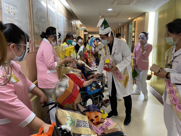 【記者林獻元台中報導】全台舉辦了一系列的萬聖節活動,衛福部豐原醫院護理之家也不列外,長者們各個「裝神弄鬼」賣力演出,完全不輸年輕人。由護理師帶領長者到各科室「搗蛋」討糖去,拿到糖果的長者開心的合不攏嘴直說:「糖果1顆不嫌少,歸包乎我恰恰好」。