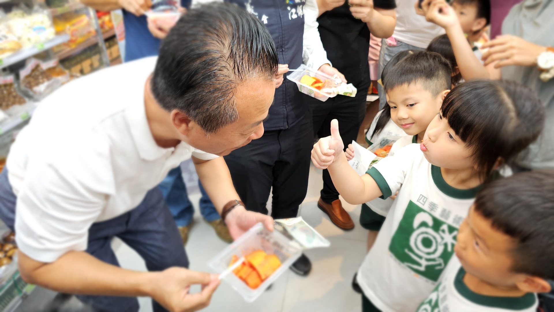 ▲嘉義縣長翁章梁親自邀請民眾試吃,小朋友豎起大拇指喊讚。(記者林明佑攝)