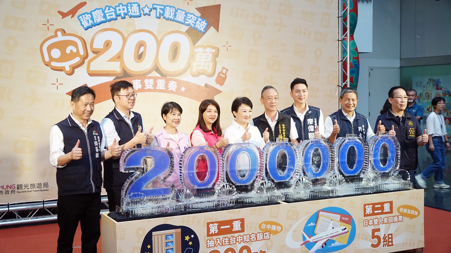 為歡慶下載數破200萬次,數位局聯手經發局、觀旅局推出「好事雙重奏」活動,配合購物節加碼送出台中知名飯店200晚住宿券、5組日本雙人來回機票,以及「驚喜抽」台中知名飯店豪華渡假房住宿一晚,邀請全國民眾下載「台中通」暢遊大台中。