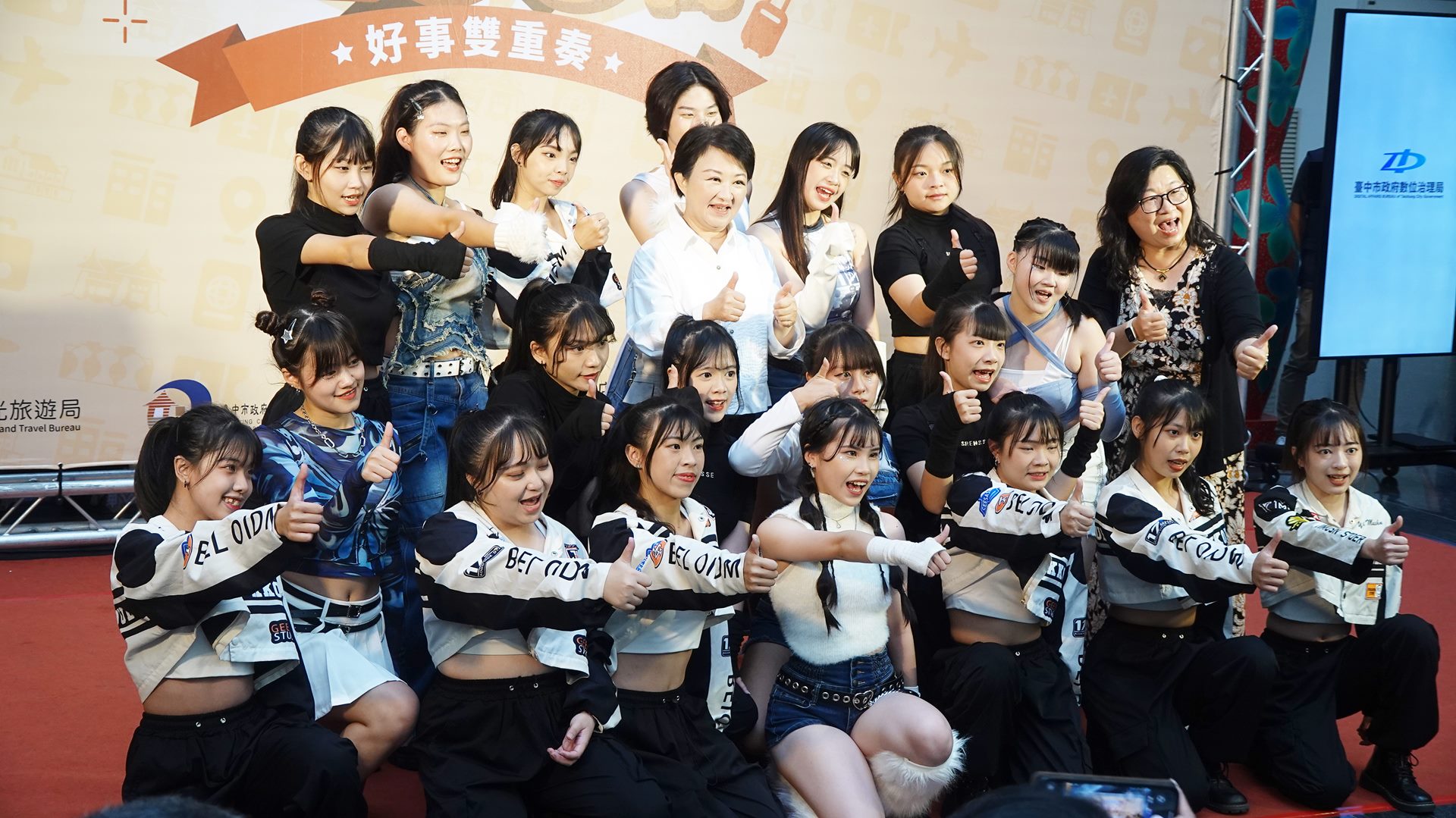 ▲台中市長盧秀燕與明台高中表演藝術科同學們合影。(記者林明佑攝)