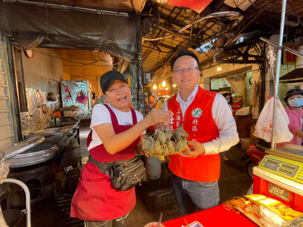莊競程5日上午,在水湳市場主委張茂雄、水湳市場攤販清潔管委會主委曾世輝、市議員曾朝榮等人陪同下,一起前進水湳市場拜票,有熱情支持者主動上前握手、合照,更有人送上象徵「包中」的粽子,與「凍蒜」的大蒜,祝莊競程連任成功。隨行的競選總部人員,沿途發送口罩,深獲菜市場婆婆媽媽喜愛。