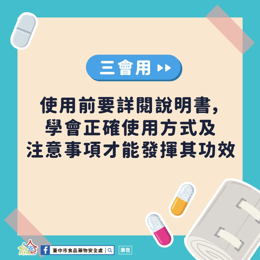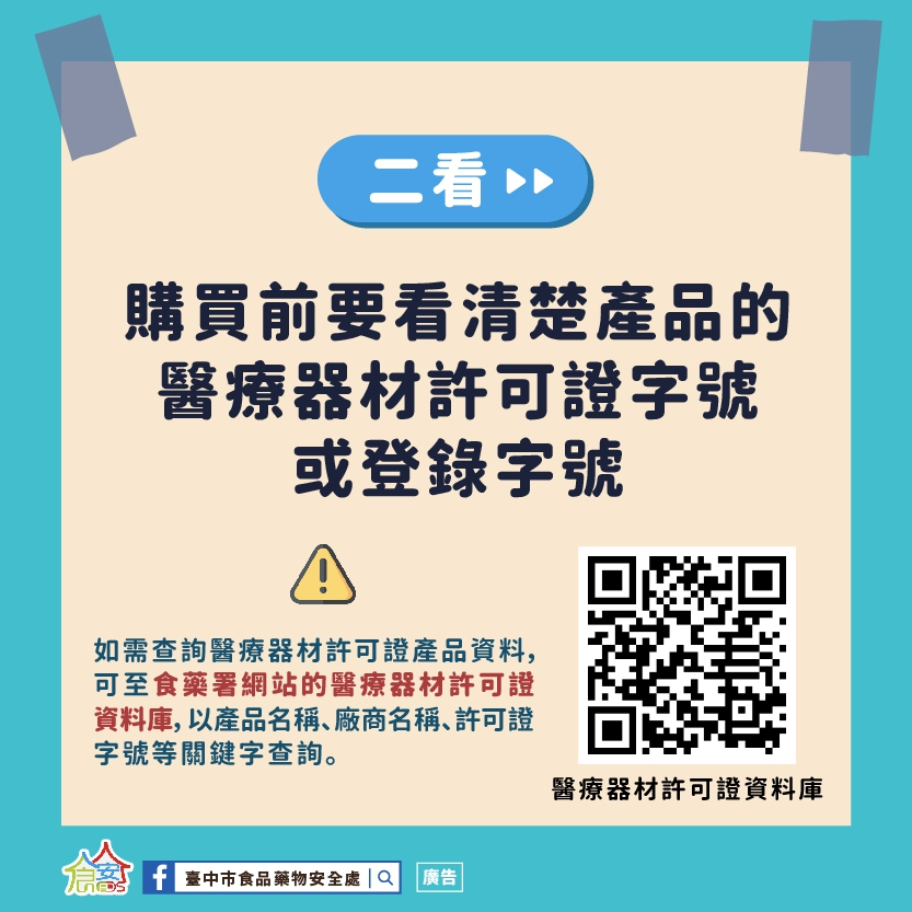 食安處進一步說明,第一步是「認」清楚合法醫療器材商或藥局來購買醫材;第二步是購買前要「看」清楚產品的醫療器材許可證字號或登錄字號;第三步是使用前要詳閱說明書,學會「正確使用」方式及注意事項,才能發揮效用,盼藉由安心三步驟,讓民眾都能選用到安心的醫療器材,食安處也將會持續加強把關,維護民眾的健康。