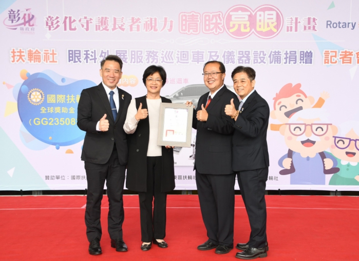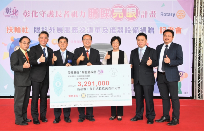 王縣長說,鹿港東區扶輪社、福興東區扶輪社和韓國水原老松扶輪社,申請扶輪社全球獎助金329萬1000元,支持衛生局計畫,購置一輛眼科外展巡迴車和6台護眼儀器,讓驗光師生深入偏鄉,協助沒辦法到專業眼科醫療院所診療的長輩,針對視網膜病變、青光眼和黃斑部病變等眼科疾病,早期發現,早期治療。