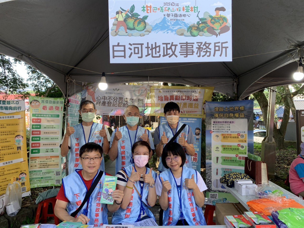 白河地政所積極參與本次活動,辦理地政相關業務政令宣導及業務諮詢,主任柯素秋特別指示下鄉宣導「地籍異動即時通」和「住址隱匿」的觀念,擺設攤位舉辦有獎徵答、FB按讚、分享、追蹤送好禮活動,吸引約150人次的民眾熱情參與,透過與民眾遊戲互動使其對地政業務更深入了解,並感謝主辦單位白河區公所區長董麗華蒞臨攤位指導並參與我們活動。