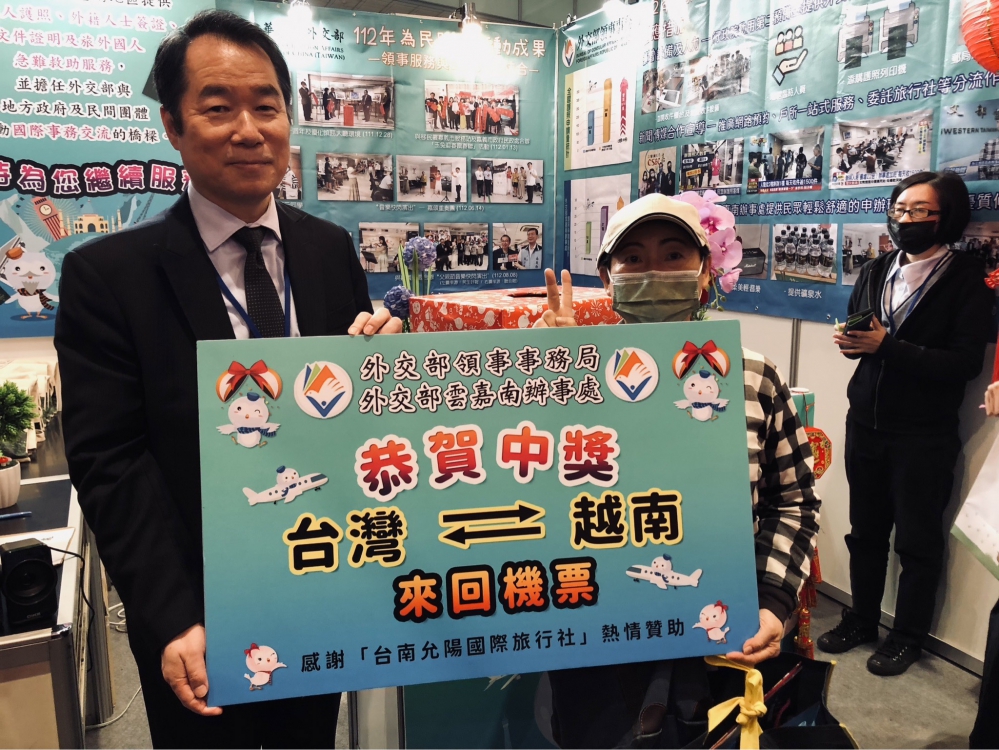 值得一提的是,今年適逢外交部雲嘉南辦事處成立11週年,領事事務局何局長特別南下參加旅展共襄盛舉,並參觀雲嘉南辦事處的攤位,為了讓更多參展民眾瞭解外交部領務局諸多有利民眾的政策與作為,在攤位現場主持「出國機票快閃抽獎」活動,並在外交部雲嘉南辦事處蕭處長及眾多參展民眾的熱情參與及見證之下,當場抽出「台灣─越南來回機票」及台南市政府認證的「台南旅遊美食觀光護照」幸運得獎者,獲獎民眾均表示驚喜。