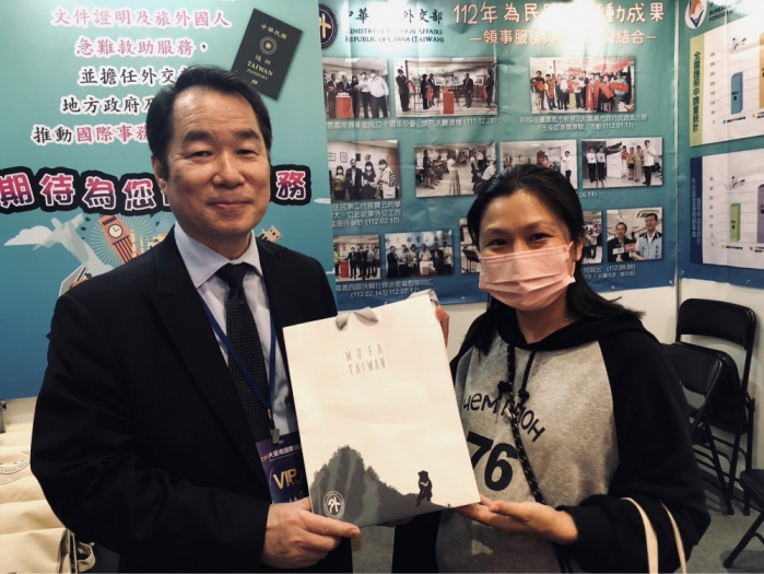 今年旅展外交部雲嘉南辦事處攤位精心準備波鴿濕紙巾、口罩、行李吊牌、盥洗包、頸枕等精美禮品,免費贈送參展的民眾,現場加入外交部領事事務局LINE官方帳號,並於LINE官方帳號內完成「出國登錄」,即可獲得抽獎活動資格,機會難得,歡迎民眾把握機會踴躍參加,得獎民眾均表示辦事處今年的活潑風格,使民眾獲益良多。