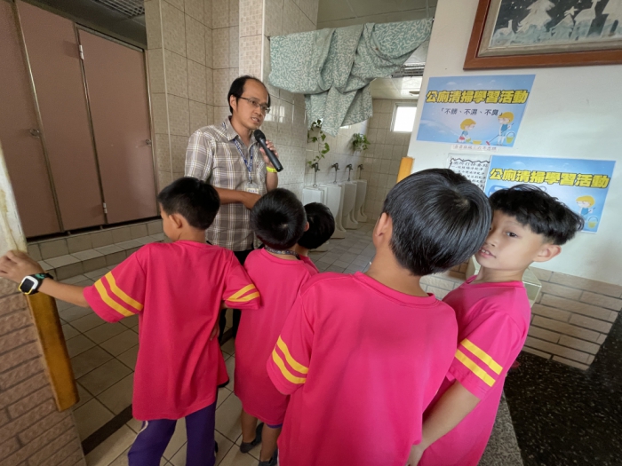 今年特地與神岡區圳堵國民小學攜手合作,活動由講師推廣「優質如廁行為」的行動與口訣(敲敲、沖沖、擦擦、洗洗),以互動及啟發方式,讓小朋友認識不同類型廁所標示、良好如廁行為口訣、辨識衛生紙丟馬桶標示,並實地至廁所示範清掃重點及技巧。