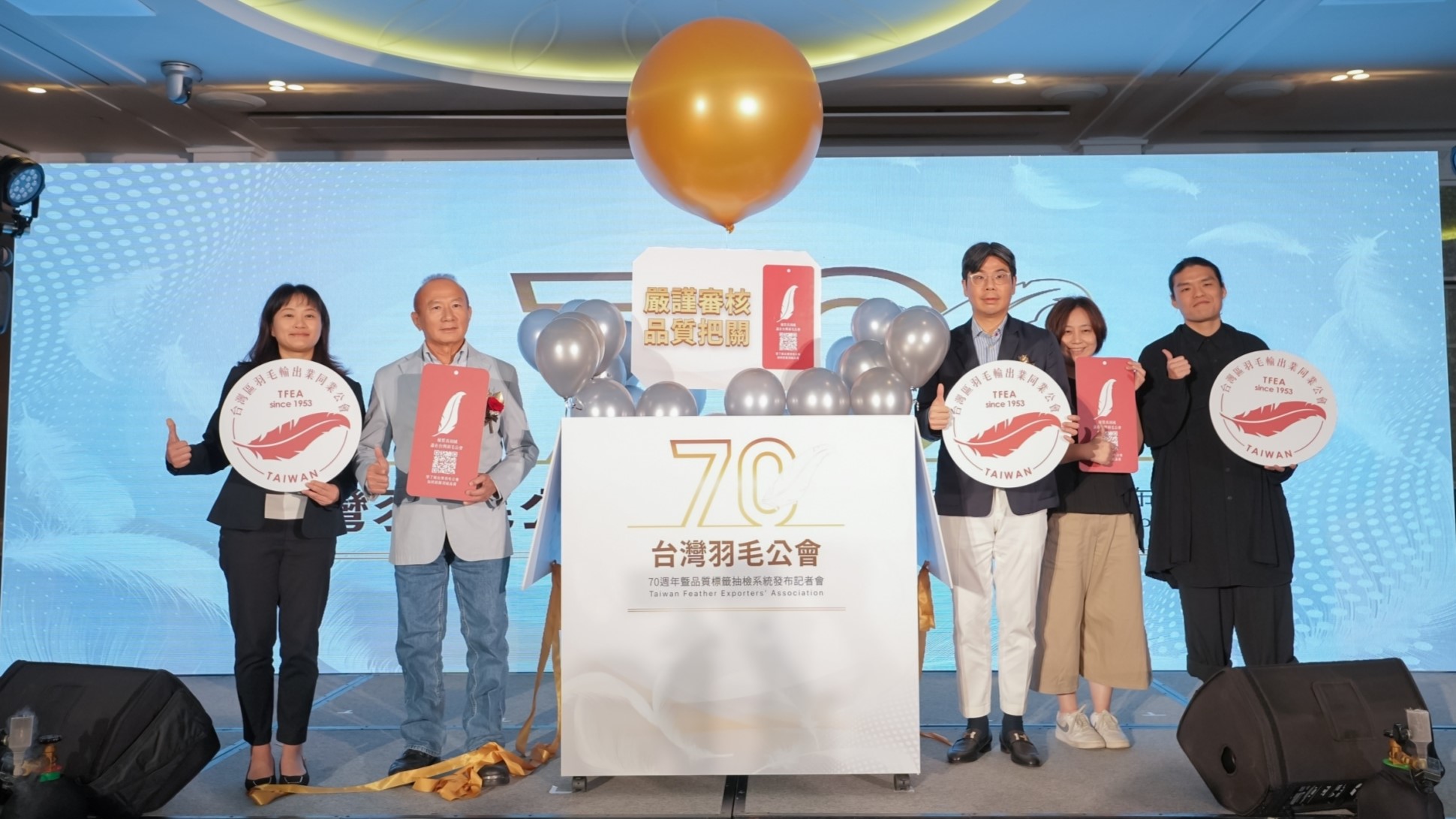 圖:台灣羽毛公會70週年暨品質標籤抽檢系統發布記者會。(左至右)合隆羽藏黃曉萍、台灣羽毛公會陳焜耀榮譽理事長、台灣羽毛公會理事長詹賀博、光隆實業BBL Premium代表、帥宇實業fomico與EASY LIFE代表