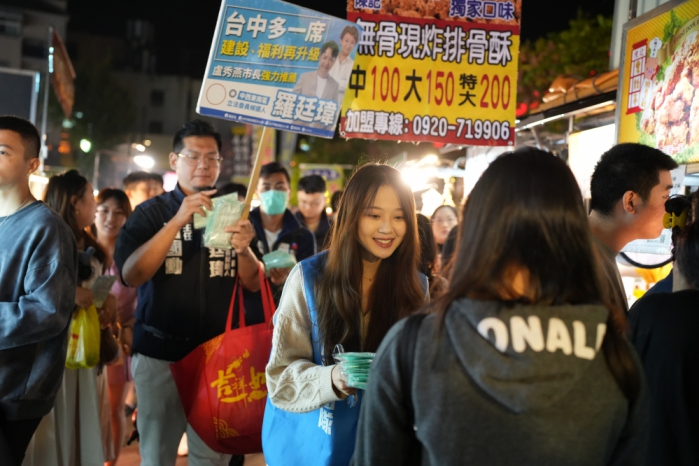 【記者林獻元台中報導】以可愛模仿動物出名,在IG擁有17萬粉絲的甜姐兒「白白」( IG: shelly0.0)24日陪同台中第六選區立委候選人羅廷瑋來到旱溪夜市拜票。適逢週末,旱溪夜市本來就人聲鼎沸,羅廷瑋和白白在旱溪夜市的入口跟攤商和民眾打招呼請託,獲得許多熱情的迴響。