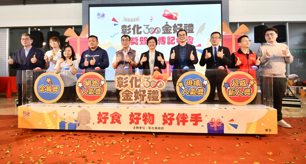 王縣長說,縣府鼓勵產業積極創新、轉型,增加品牌形象,乃透過良性競爭,舉辦「2023年彰化金好禮甄選」,今日頒獎行銷得獎商品。