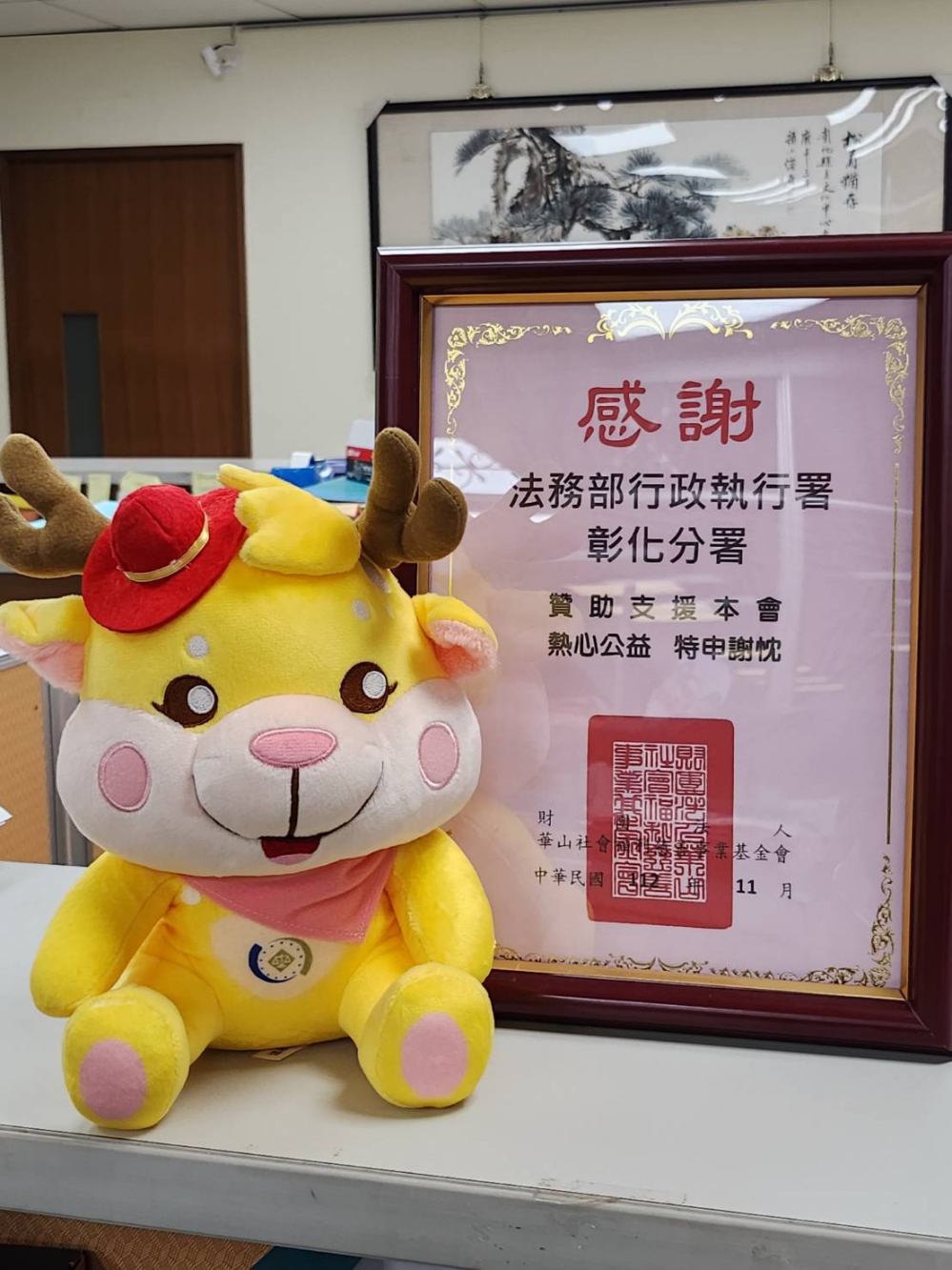 分署發言人江佳蓉指出,在熱情鄉親和分署鼓吹下,義賣得款1萬餘元,今日由法務部行政執行署長黃玉垣和彰化分署長郭景銘代表彰化分署,贈給華山基金會彰化愛心天使站,將作為弱勢長輩年菜之用,表達團圓和暖暖心意,讓彰化分署義賣開啟「愛的循環」。