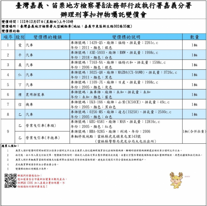 【記者張文一嘉義報導】為落實沒收刑事案件不法犯罪所得,阻斷犯罪利基,以有效遏止犯罪的目的,臺灣嘉義、苗栗地方檢察署囑託行政執行署嘉義分署代為拍賣9部被告所有或供犯罪所用之汽機車。嘉義分署定於12月7日(星期四)上午10時於嘉義地方檢察署大型贓物庫(地址:嘉義市東區新生路302巷35號)進行拍賣,拍賣物件皆是低底價,歡迎想撿便宜之民眾踴躍到場競標。