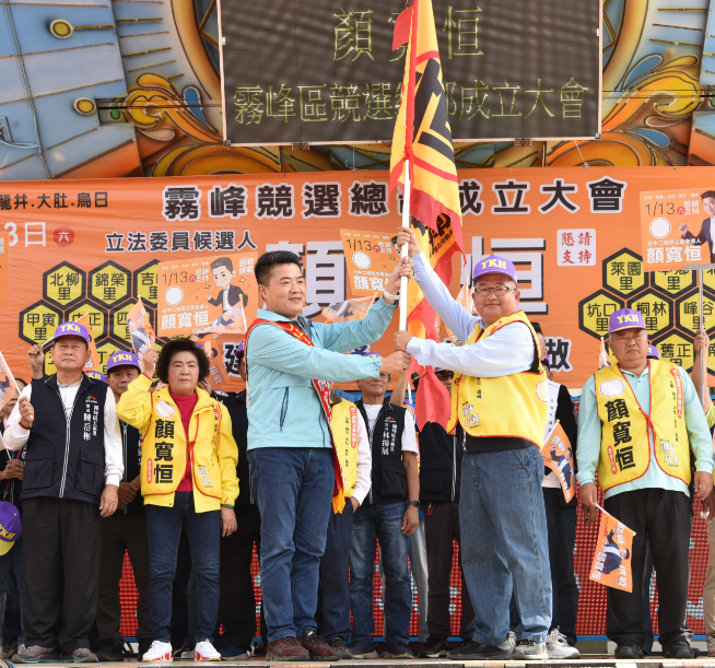 顏寬恒在戰鼓、祥獅開道及不分黨派民代、支持者簇擁下大進場,台中市議員林碧秀、蘇柏興、江和樹、張滄沂及霧峰區農會總幹事黃景建、霧峰鄉前鄉長曾瑞昌聯合致贈包粽、好彩頭、青蒜、旺來等吉祥物祝福高票勝選,顏寬恒將戰旗授予競選總部總幹事王原祥,象徵旗開得勝,現場旗海飄揚。