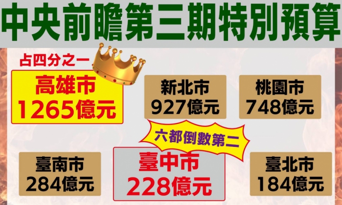 陳成添再來提到,中央前瞻預算補助總共5,358億元,高雄市獲得1,265億元(占1/4),而中市上繳近2000億,僅分配到228億元(六都第五);統籌分配款中市人均分配額度1萬3630元(六都第四);一般補助款台中市獲得109億元,較台南、高雄少了70億元,各縣市的補助明顯有落差。