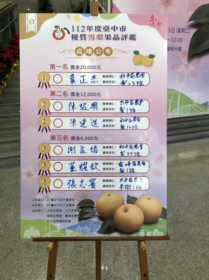 經評審仔細品嘗評分後,由和平區黃正杰榮獲第1名,勇奪今年度的雪梨王,將獲得獎牌及獎金2萬元;第2名為太平區陳招興及和平區陳建進,可獲得獎牌及獎金1萬2000元;第3名則分別為和平區謝孟儒、霧峰區董耀欽及太平區張志賓,可獲得獎牌及獎金5000元。