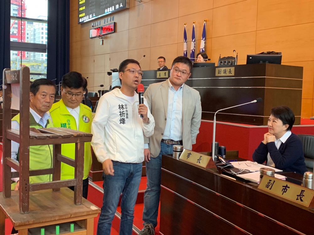 林祈烽、鄭功進、施志昌和楊典忠4位議員直接把一組老舊和椅子已崩裂的課桌椅搬到議場給市長盧秀燕看。林祈烽說,學生常抱怨老舊的課桌坐起來不舒服、會夾屁股,之前民進黨江肇國議員就關心並質詢這件事,教育局蔣局長承諾他會在3、4年內要編足預算全面汰換,副市長王育敏也支持,但換了國民黨羅廷瑋議員質詢,蔣局長竟然否認有這件事。
