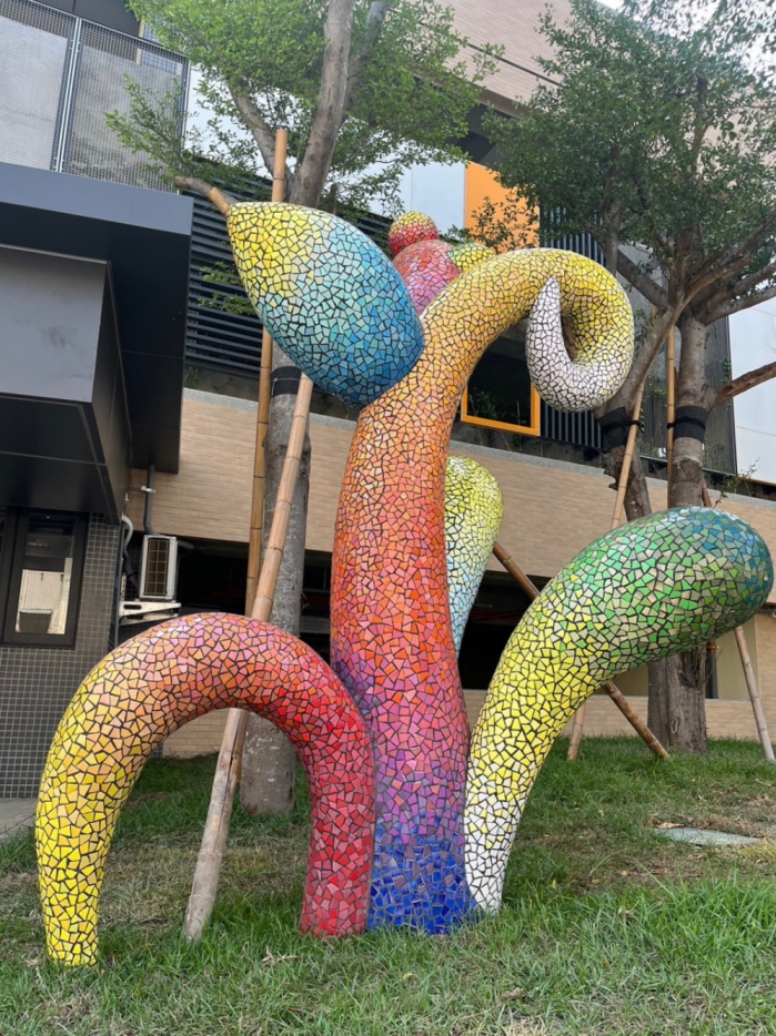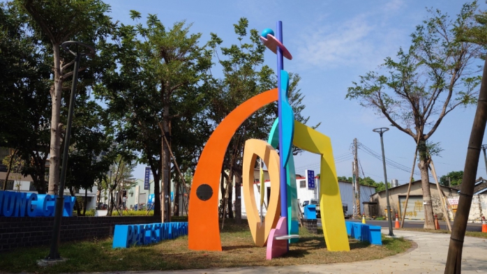 「即使是停車場,也會讓大家賞心悅目,心曠神怡」葉昭甫說明,此停車場位於東側嶺東路旁圓形廣場中軸線與西側文山六街旁,新近完成的《匯聚.永續》及《躍動之森》兩座公共藝術作品,為結合科技、藝術及公共建設,加上特別彩繪的一樓機車區牆面,推動藝術文化的交流與發展,除有助於社區形象的提升,也可藉由與啟聰學校的合作,打造充滿色彩和歡樂的環境。