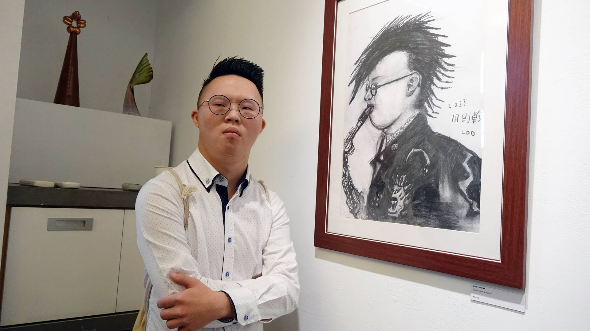 ▲特殊藝術家周則翰與參展作品合照。(記者林明佑攝)