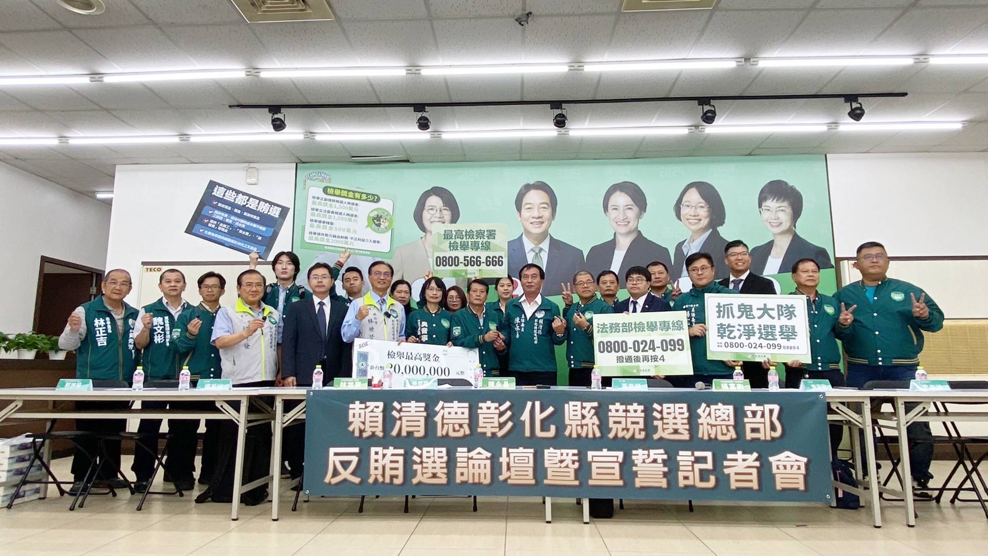 賴清德彰化縣競選總部主任委員陳永昌表示,選戰倒數32天,近期彰化賄選態樣推陳出新,賄選傳聞滿天飛,再加上中國介選鎖定彰化,招待村里長赴中旅遊,手法形同賄選,故競選總部結合賴清德全國律師後援會,組成反賄選大隊,快速處理選民檢舉賄選情資,終結彰化惡質選風!