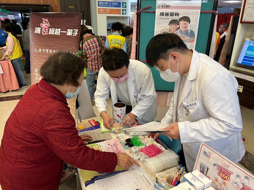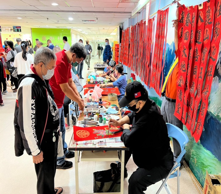 這次義賣活動現場有吳信蒼書老師號召多位書法老師現場揮毫,還有真材實料的年節瓜果,志工自製的韓國泡菜,讓民眾提早感受到濃濃的年味。也藉著人潮,透過有趣的有獎徵答,提供器官捐贈及預立醫療、家庭暴力、兒少保護、性侵害防治、自殺預防宣導。精神科日間慢性病房提供精緻的手工零錢包與提包,展現了慢性精神病患的復健成果。