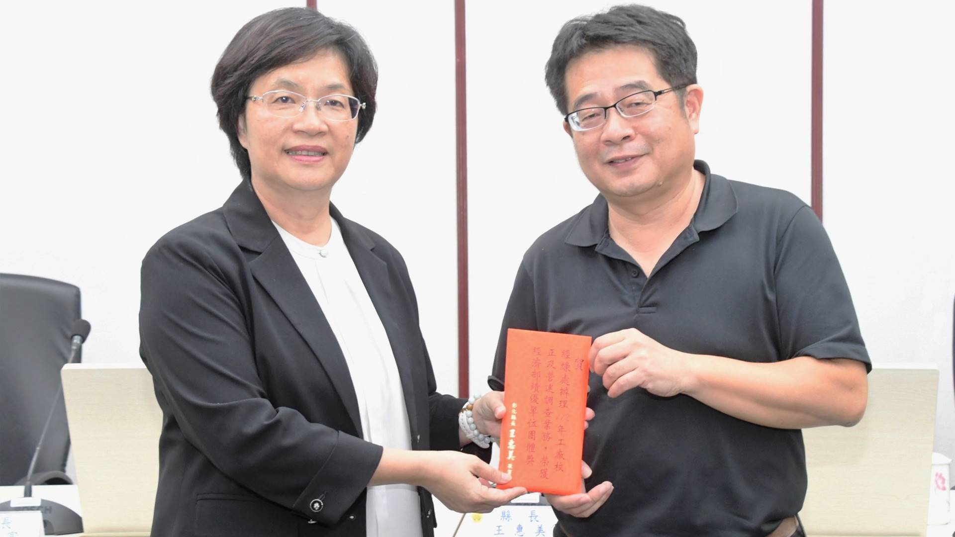 ▲彰化縣政府榮獲經濟部「112年工廠校正及營運調查評比」績優單位團體獎,彰化縣長王惠美於主管週報表揚,由經濟暨綠能發展處處長湯國榮代表接受,王惠美肯定同仁的用心及認真。(彰化縣政府提供 )