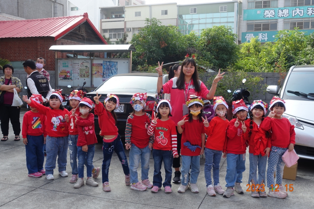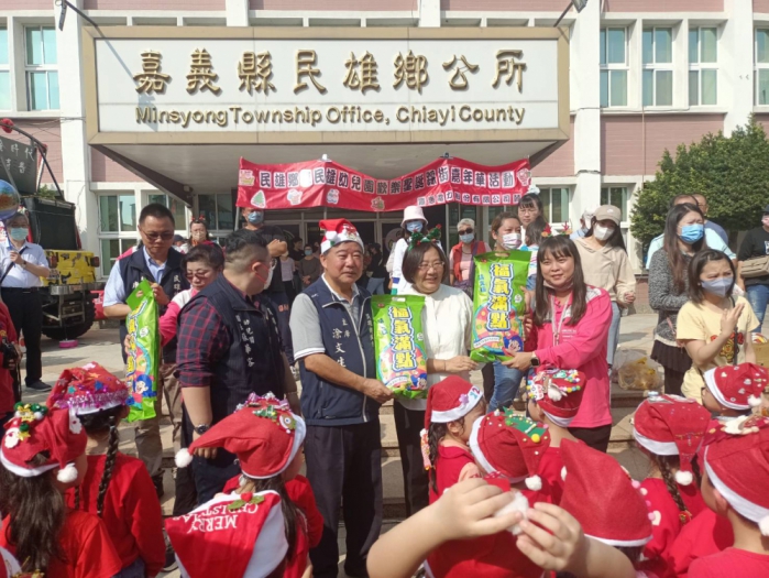 小寶貝們獨一無二的創意裝扮造型,都是由家長及幼童共同創作,藉此增進親子間的感情。他們認真練習的各項打擊樂器也在沿途展現與大家共樂,幼兒園全園師生於保生大帝廟集合出發,經過熱鬧的民雄街面,途中發送甜蜜幸福的糖果,與鄉親熱情互動,最終回到公所前廣場,由寶貝們帶來最應景的聖誕快樂樂器表演及帶動唱等,最後林于玲鄉長、涂文生主席及聖誕老公公發送象徵祝福的糖果,將氣氛整個嗨到最高點。