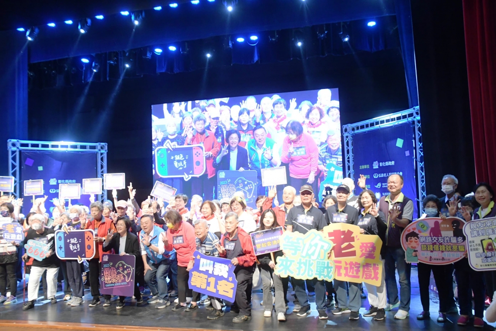 「銀色電玩手,成果交流賽」,縣府邀8位高年齡長輩體驗時下年輕人最夯的電競「SWITCH」,經12堂課程培訓和學習後展示成果,王縣長說,去年,到社區教導有興趣的長輩,經電玩訓練後進行比賽,今年精進改良,由8個社區先教長輩以SWITCH電玩主機搭配遊戲,訓練12堂課之後選出40名長輩選手電競,40人的總年齡達3004歲,平均75歲,其中最高齡是84歲的春雄阿公、富美阿嬤、月雲阿嬤,期盼動動腦,與年輕世代接軌,展現不老精神,讓長輩活到老、學到老、健康到老。