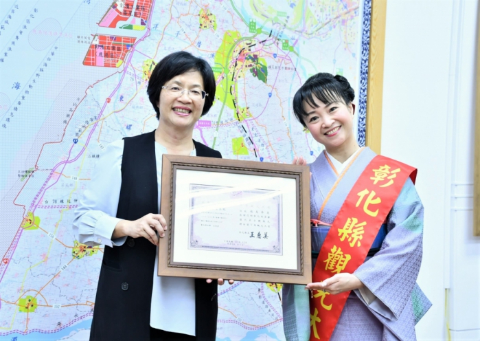 王縣長說,飛鳥奉美是日本演歌女王,2019年底擔任彰化縣觀光親善大使,但因疫情無法來台宣傳彰化之美,這次藉來台舉辦演唱會機會,來到彰化。
