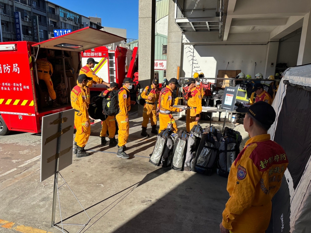 消防局長孫福佑指出,中市消防局特搜大隊已做好待命出勤準備,包括33名特搜人員、2隻搜救犬(Parker、Melody),各式救援裝備皆已整備完成,如光纖式影像探測儀、混泥土鏈鋸、圓盤切割器、AZ腳架、鑿岩機、鑽孔機、重型救援頂昇支撐器材、雷達生命探測器等,待收到消防署出動命令,將即刻馳援災區,展開人道救援行動。