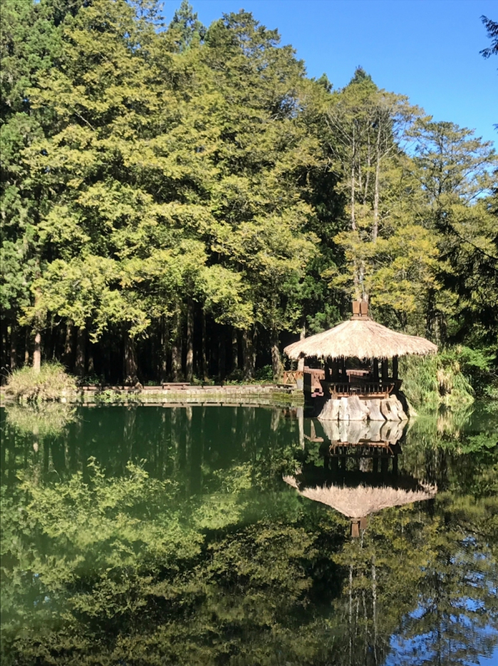 姊妹潭步道主要是串聯阿里山閣與姊潭、妹潭二處景點,沿線有許多有檜木圍繞,其樹形特殊,不同角度欣賞皆有意象禪意。姊潭湖心有涼亭,亭影倒映湖面景緻優美,是遊客最愛佇足取景地點之一,而潭的周圍有環湖棧道,可供遊客漫步欣賞湖景。山林環抱湖水,湖水如翡翠碧綠,樹影倒映湖面,景緻幽雅怡人。