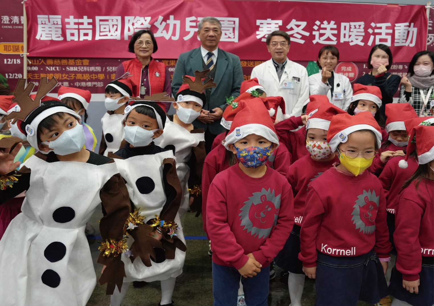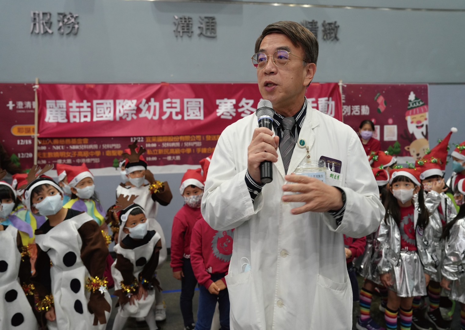 ▲澄清醫院謝良博副院長歡迎麗喆國際幼兒園小朋友寒冬送暖表演。(記者林明佑翻攝)