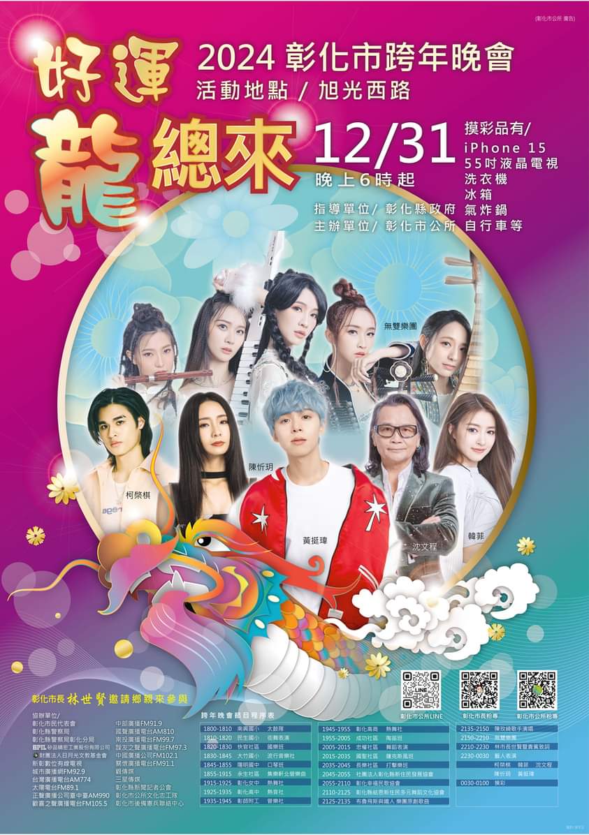 彰化市公所為迎接2024年舉辦『龍年』跨年晚會,12月31日晚上6點整起,在旭光西路熱鬧登場,表演單位包括社區、學校、與民間團體等輪番上場,分別表演舞蹈、國樂、歌唱與熱舞等;同時有多名歌手開唱,也提供了包括iPhone 15、55吋液晶電視、洗衣機、冰箱、氣炸鍋、自行車等豐富大獎的摸彩品,市長林世賢歡迎鄉親一起來High翻跨年夜,期待新的一年「好運龍總來」!