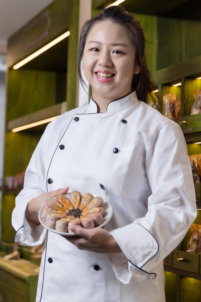 擁有12片花瓣造型的「花漢餅」正是姐姐郭碧琪研發近一年的最新產品,多層次堆疊口感的酥皮皆為手工製成,造型上強調立體感,製作工續繁瑣且精細,才能製作出一顆完美的「花漢餅」;而內餡口味分別有傳統「古早味招牌滷肉綠豆沙」與台日結合的「白玉金沙芋泥」;「古早味招牌滷肉綠豆沙」吃起來酥鬆綿密,鹹香的滷肉拌著綠豆沙餡,鹹甜適中且不油膩,佐上一杯熱茶,油脂香化在口中讓人難忘。而「白玉金沙芋泥」的白玉取自日本古法製作工法,口感猶如麻糬,結合日式芋泥再加上台灣人最愛的金沙(鹹蛋黃),鹹甜交錯的味道,加上酥綿的口感,入口後香氣蔓延鼻樑,每一口都可以吃到滿滿的用料誠意。